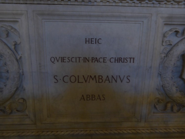 The tomb of Columbanus is in the crypt beneath the altar of the monastery church he founded in 614 AD. The inscription reads, “Here rests St. Columbanus, Abbot, in the peace of Christ.”